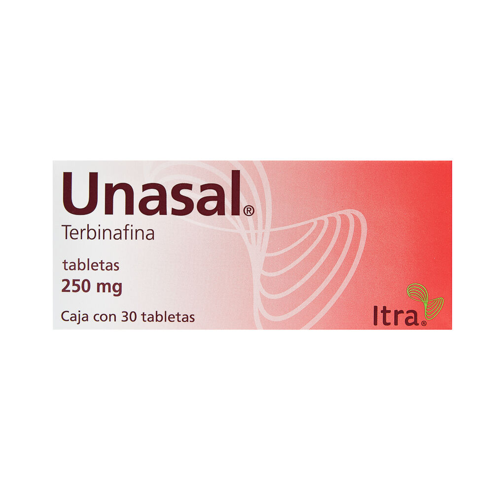 Unasal 250mg 30 tabs está indicado en el tratamiento de Onicomicosis, Dermatomicosis con tiña capitis, Corporis y cruris causada por gérmenes sensibles a la terbinafina