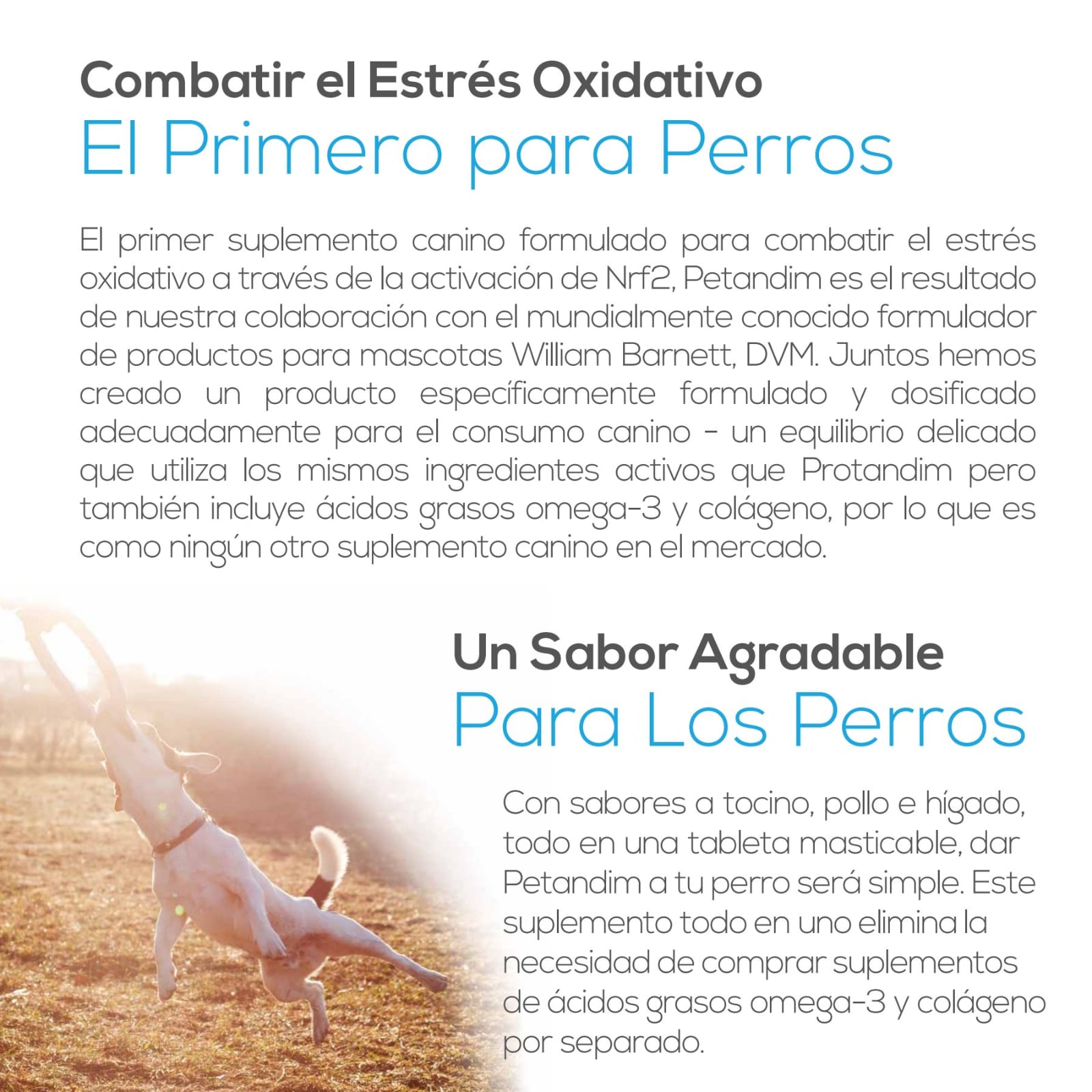 Petandim Dogs es un suplemento alimenticio premium en tabletas masticables diseñado específicamente para combatir el estrés oxidativo en caninos. Formulado por los fabricantes de Protandim, este producto utiliza la activación de la vía Nrf2 para ayudar al organismo del perro a producir sus propios antioxidantes naturales. Su fórmula integral está orientada a mejorar la calidad de vida de las mascotas, apoyando la salud celular y promoviendo un envejecimiento saludable a través de ingredientes que favorecen el bienestar general del animal.