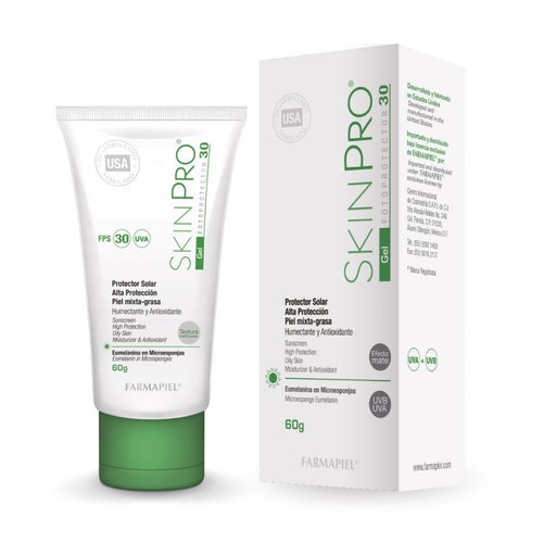 Skin Pro Gel Spf30 60gr de Farmapiel es un fotoprotector facial en gel que ofrece una alta protección de amplio espectro (FPS30) contra la radiación UVA y UVB. Su fórmula incluye Eumelanina en microesponjas para una protección adicional y un potente efecto antioxidante.
