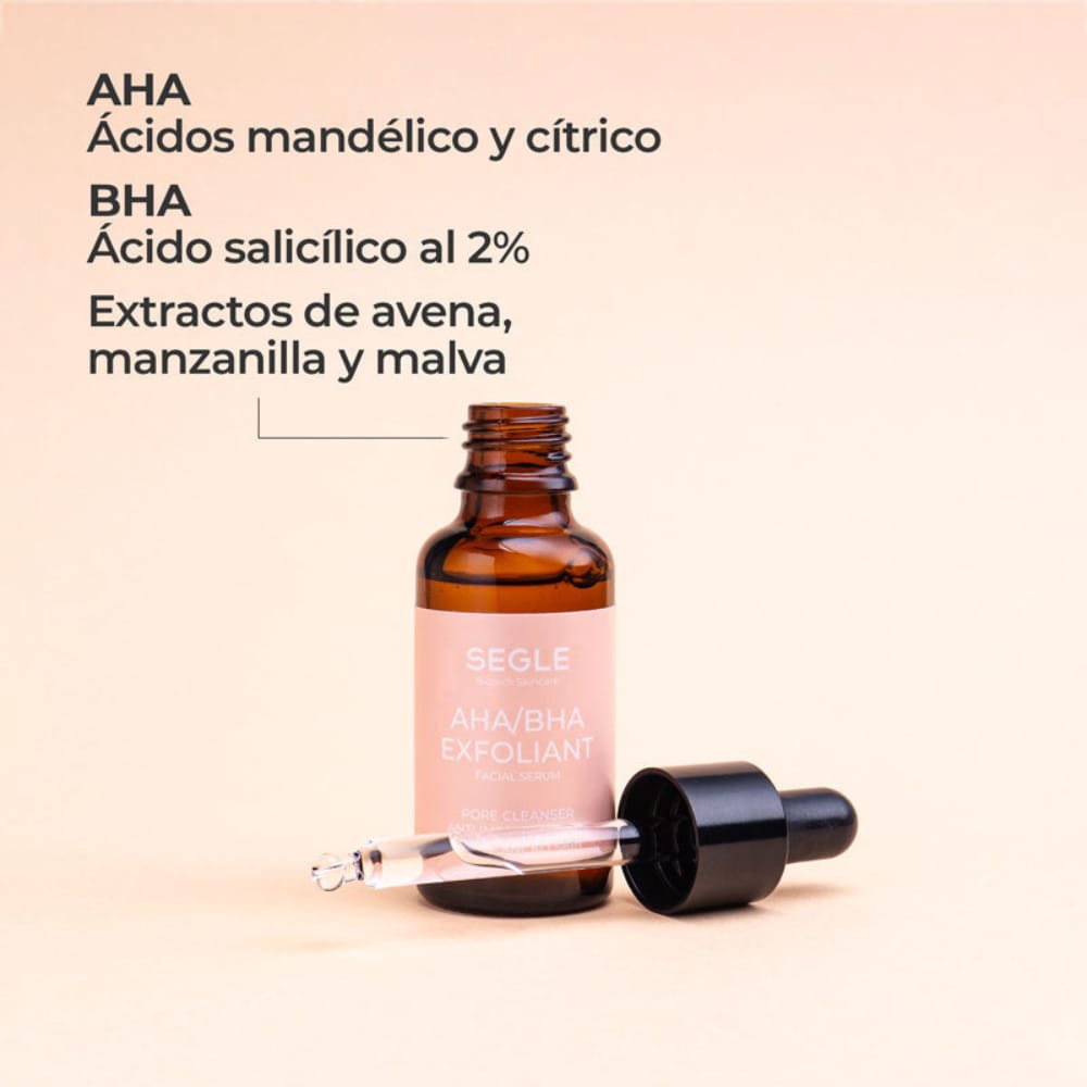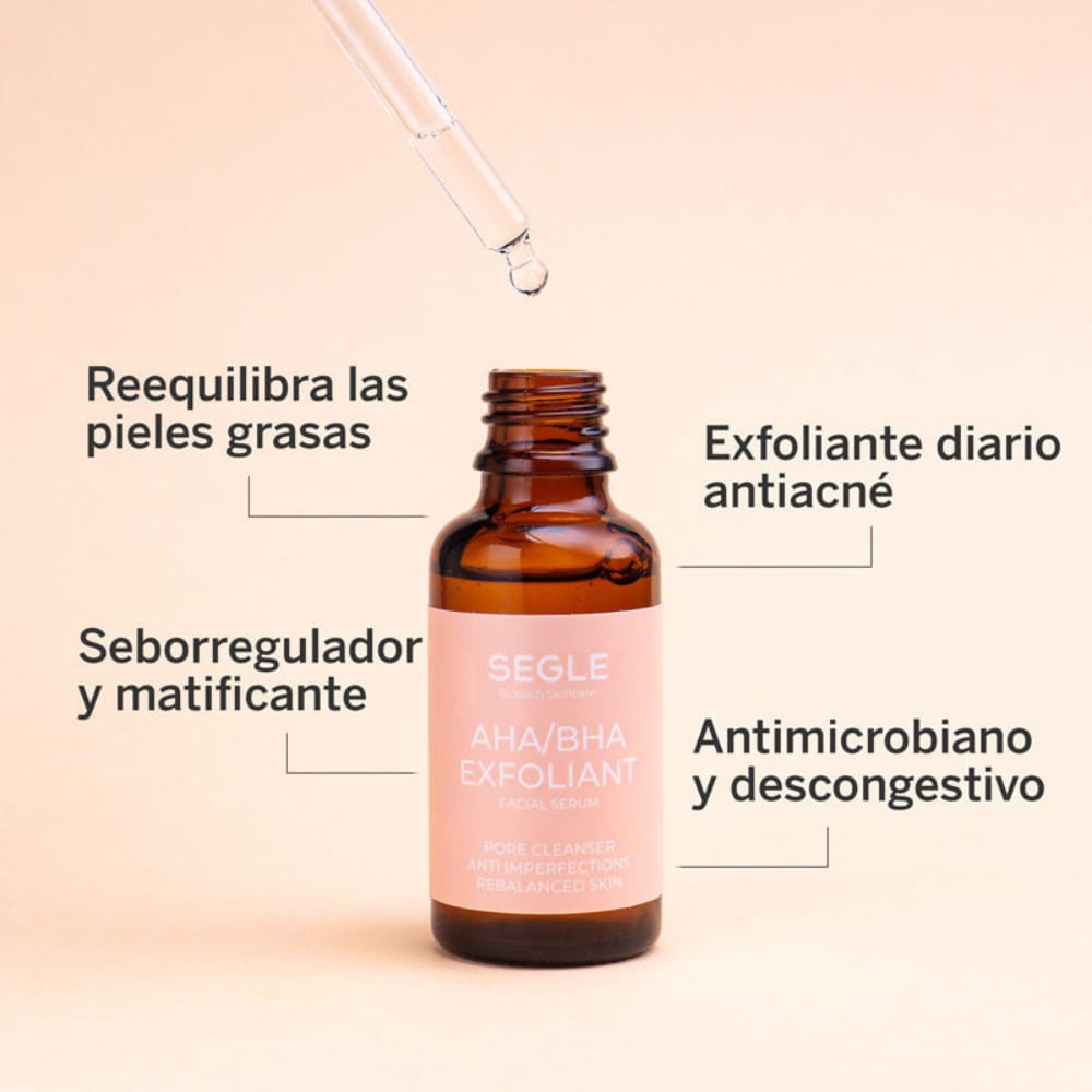 Exfoliante Aha/Bha Serum 30ml (Segle) es un exfoliante diario, antioxidante, limpia y desobstruye poros, seborregulador, refuerza la función barrera.